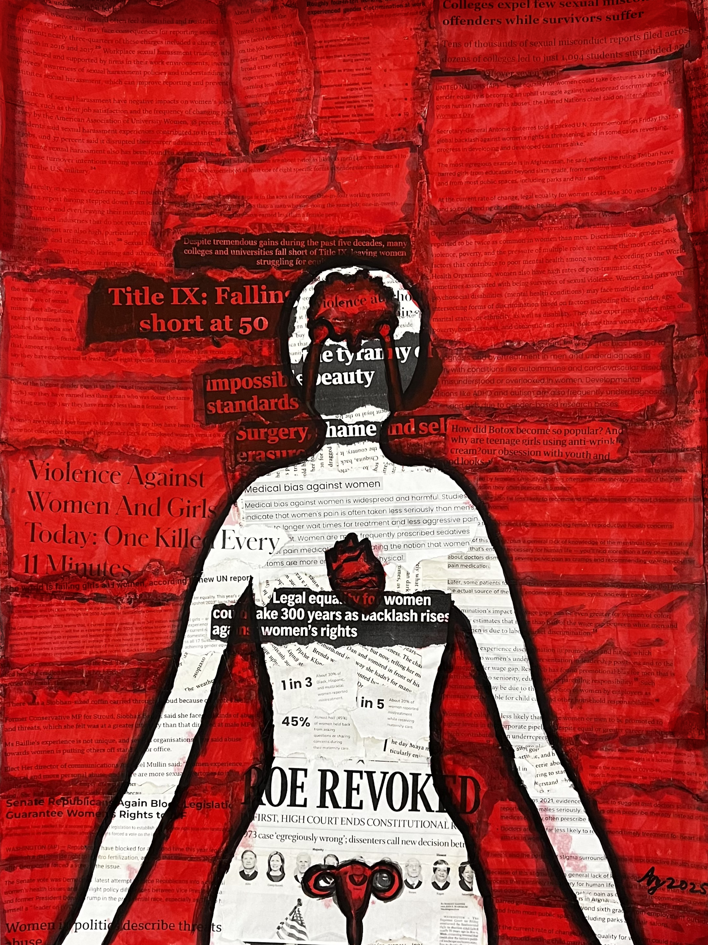 "Caged Bodies", 2025, Paper Collage and Ink, 24"x18"