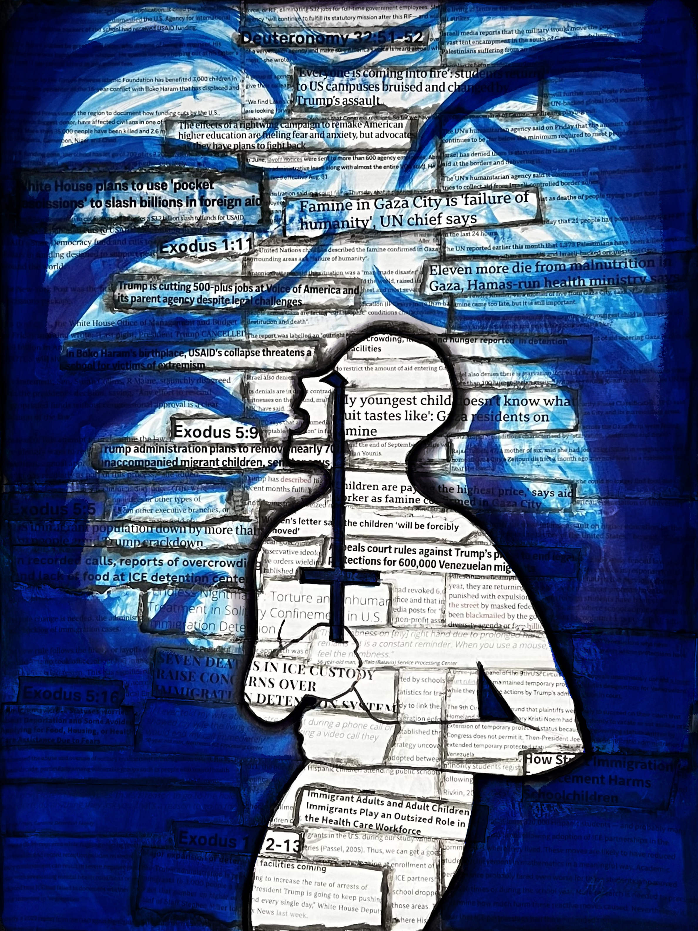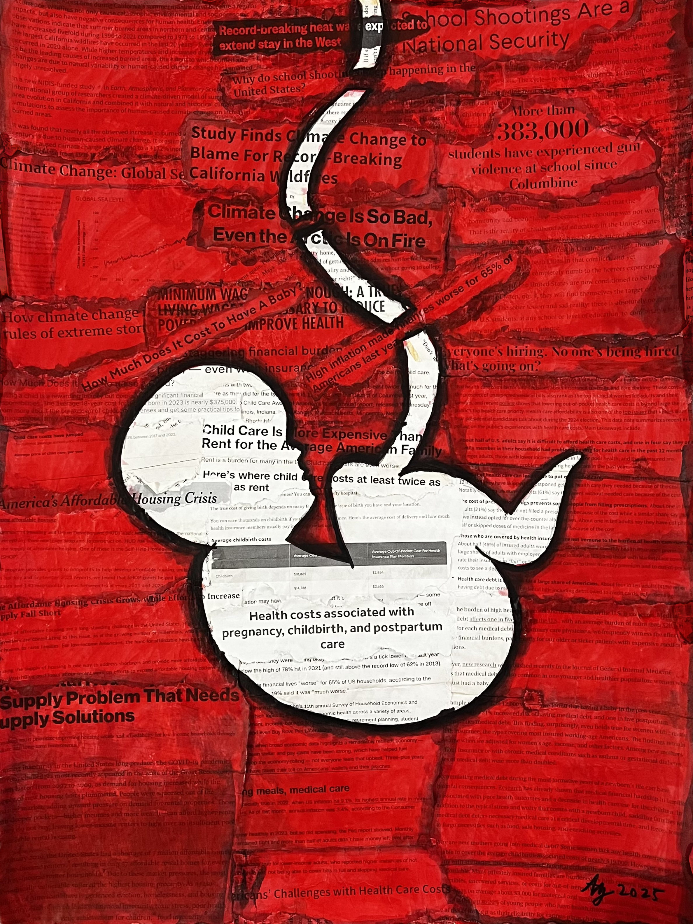 This is a series of three mixed media ink and paper collage works addressing contemporary US socioeconomic and political conflicts. Each background behind the illustrations are comprised of articles from the past two years (2024-2025) in which the central work is alluding to.